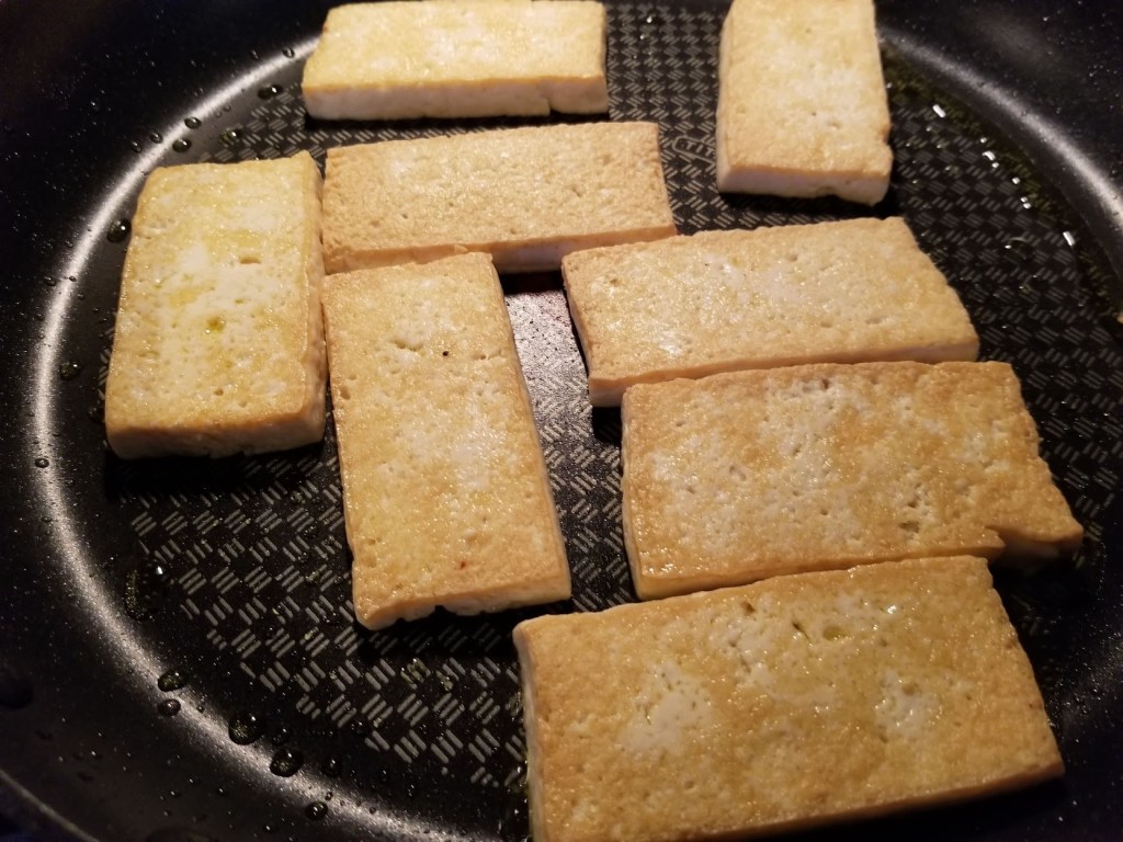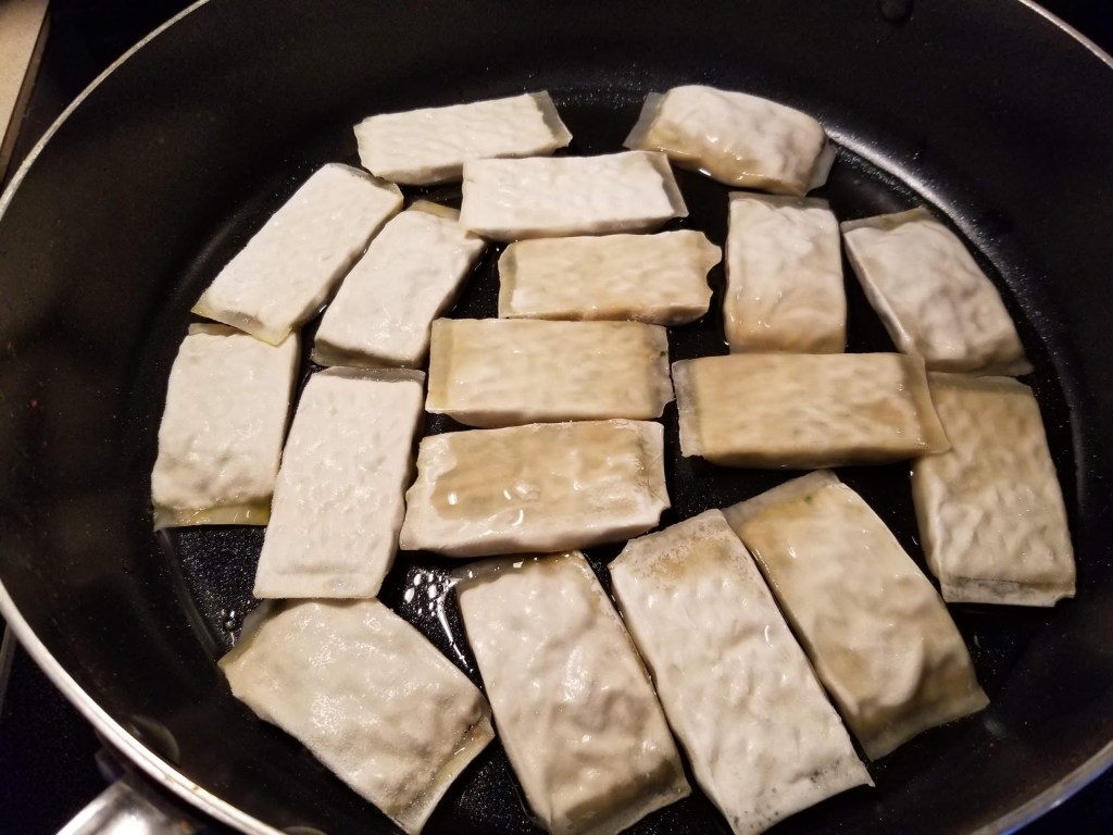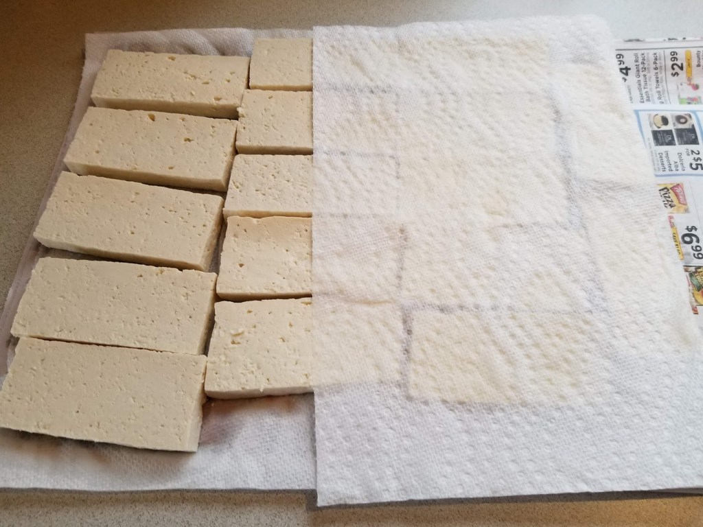 Yay! Tofu looking nice and dry and ready to pan fry.