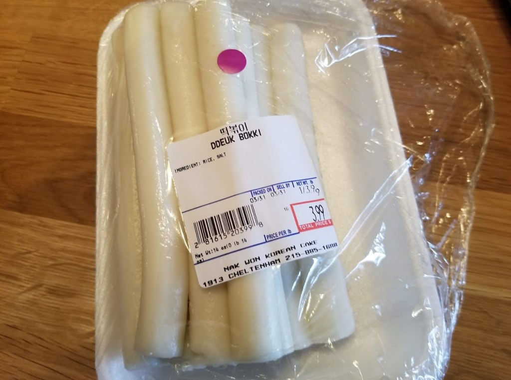 Normally, you can make dukbokki with refrigerated/frozen rice cakes, but since I knew I had to somehow crisp these guys up, I knew I had to start with fresh rice cakes. This used to be a full package, but rabid Callie clawed a few pieces out on the drive home from Hmart.