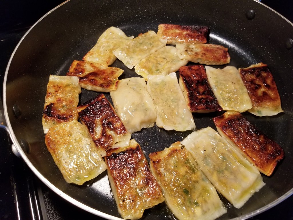Whoops! Got some serious uneven heating on this pan. Took a minute to move the dumplings around and even out the skins. I’m going to blame my weird black-glass range. I miss gas.