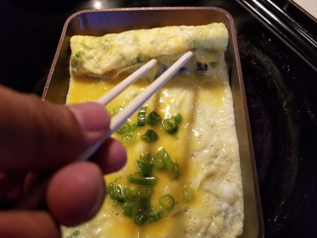 Then start rolling it up – for the first roll, I find it easiest to do with wooden chopsticks. For final shaping, I use a spatula. Once you roll it all the way to the left, you move the whole roll to the right, then pour another 1/4 of the egg mixture in for the next layer.