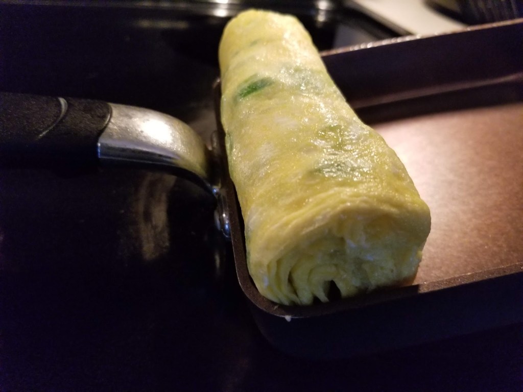 I really like eating cold, rolled, japanese-style omelets in the morning. Four eggs beaten, salt, scallions, and I usually mix it all up in a pyrex measuring cup with a spout. I pour maybe 1/4 of it into this square omelet pan until it starts setting.