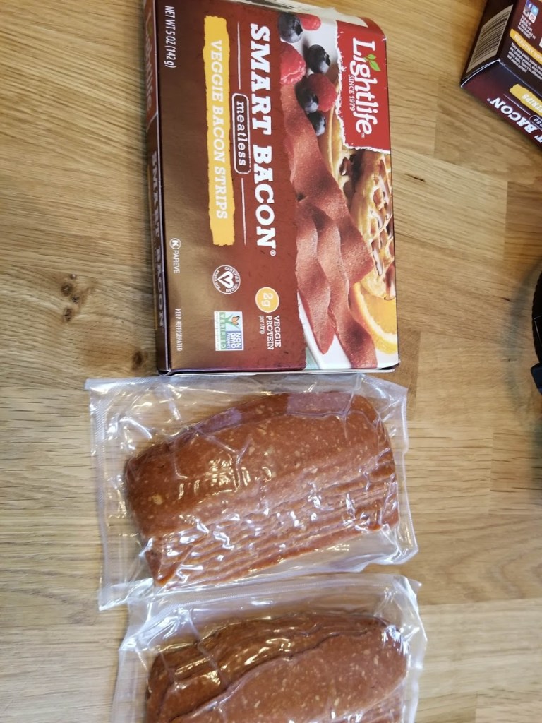 Time to crisp up some veggie bacon so we can have wedge salads during the week! Also, breakfast burritos with eggs, cheese, and veggie bacon.
