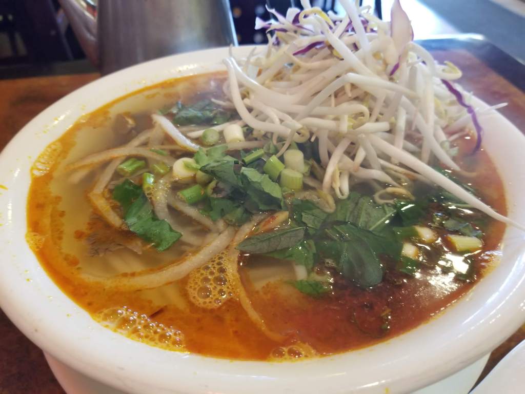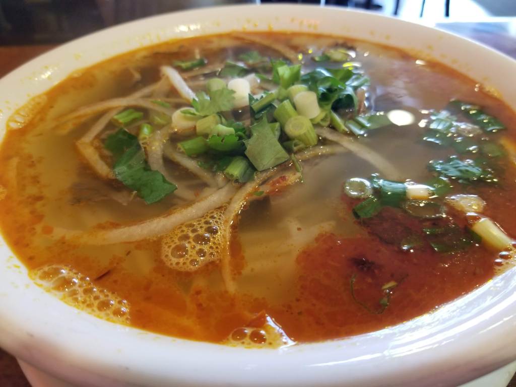 Then the main course! If you’re not familiar, bun bo hue is a spicier, north Vietnamese noodle soup. It’s like pho with an Infinity gauntlet. Most places in America, you’ll get it “American-style” with normal cuts of meat, which is fine by me. More authentic places will add blood cubes, which I am NOT into. And the super authentic places (where you can’t even read the menu, if there is one) will add ox penis, which I’m definitely not into.