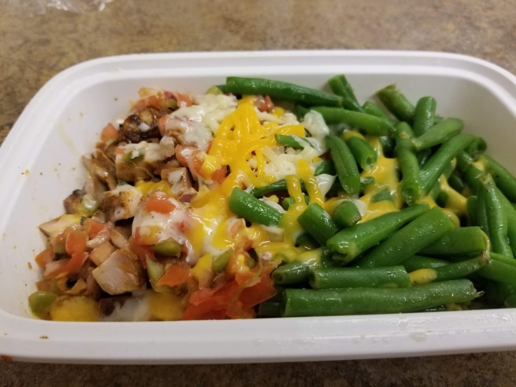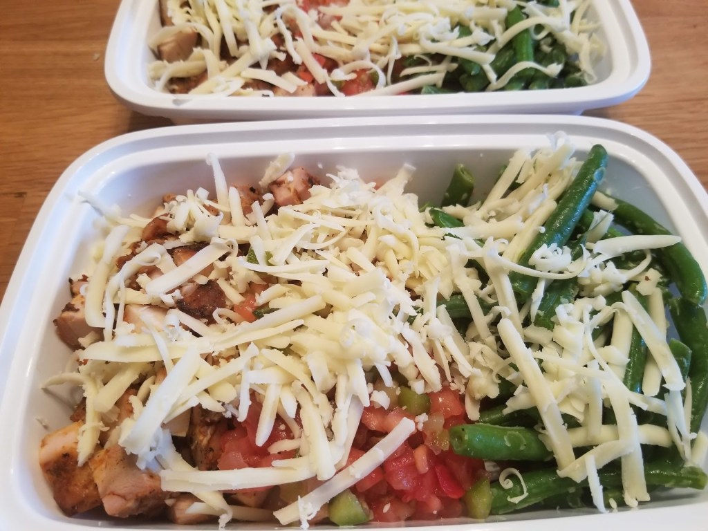 Dice up the chicken, throw in containers with some store bought pico and some buttered up green beans, top it all with cheese and I have lunches for the week!