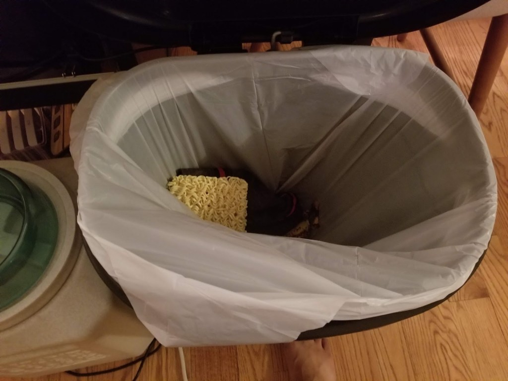 Also, I’ve had a few glasses of wine and I know myself, and I know that if the veggie noodles suck, I’ll try again with real noodles, so I gotta throw them away. And then throw away something else nasty that’s been sitting in my refrigerator on top of it, so that I can’t salvage the dry ramen noodles from the trash either. “Know yourself, know your enemy, and you will win 100 out of 100 battles” – Sun Tzu, bitches. Battle against carbs won.