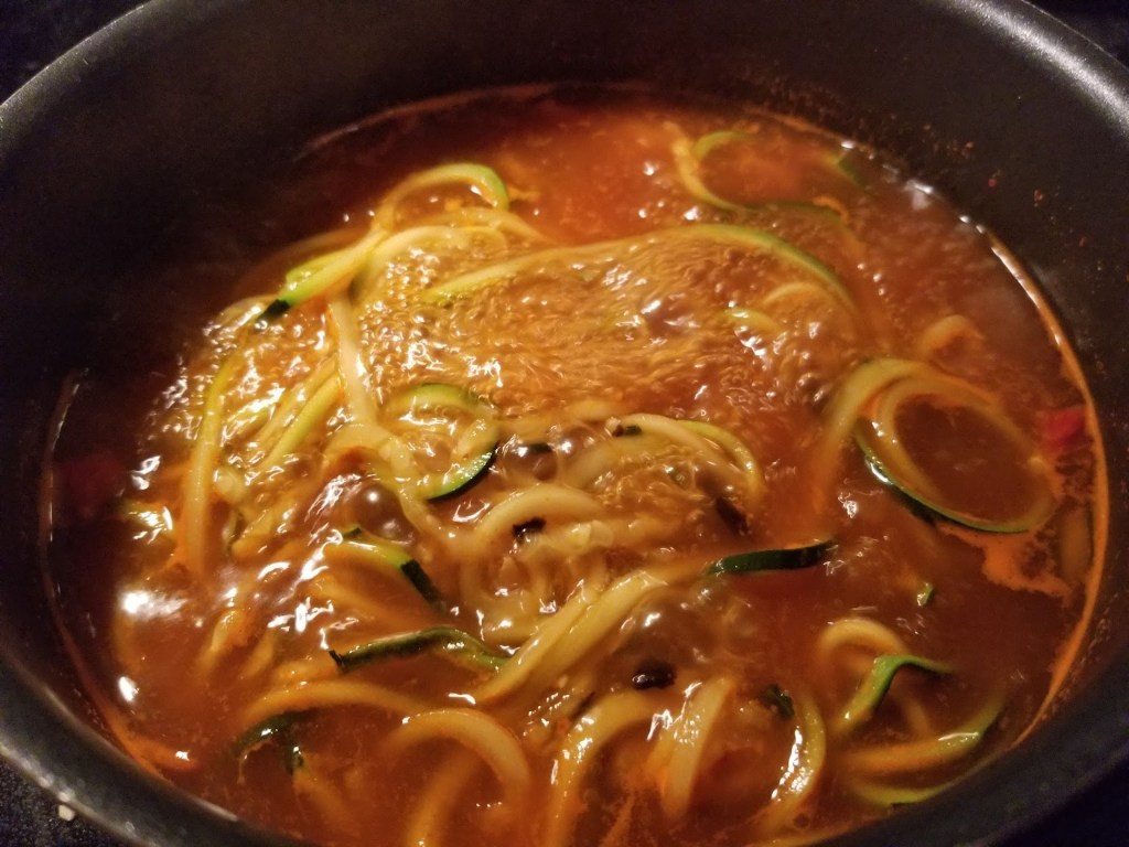 End result – not perfect, but actually very promising! I definitely overcooked the zoodles a bit, but I think a minute or two less and I’ll have a serious low-carb ramen solution.