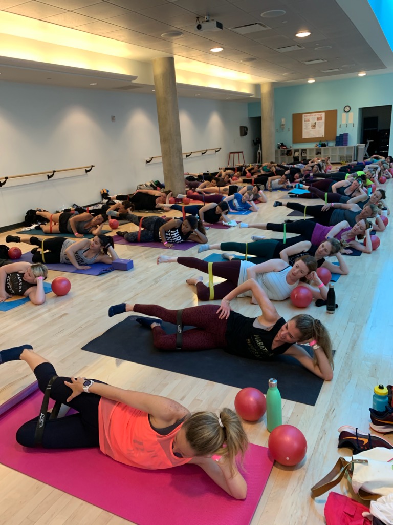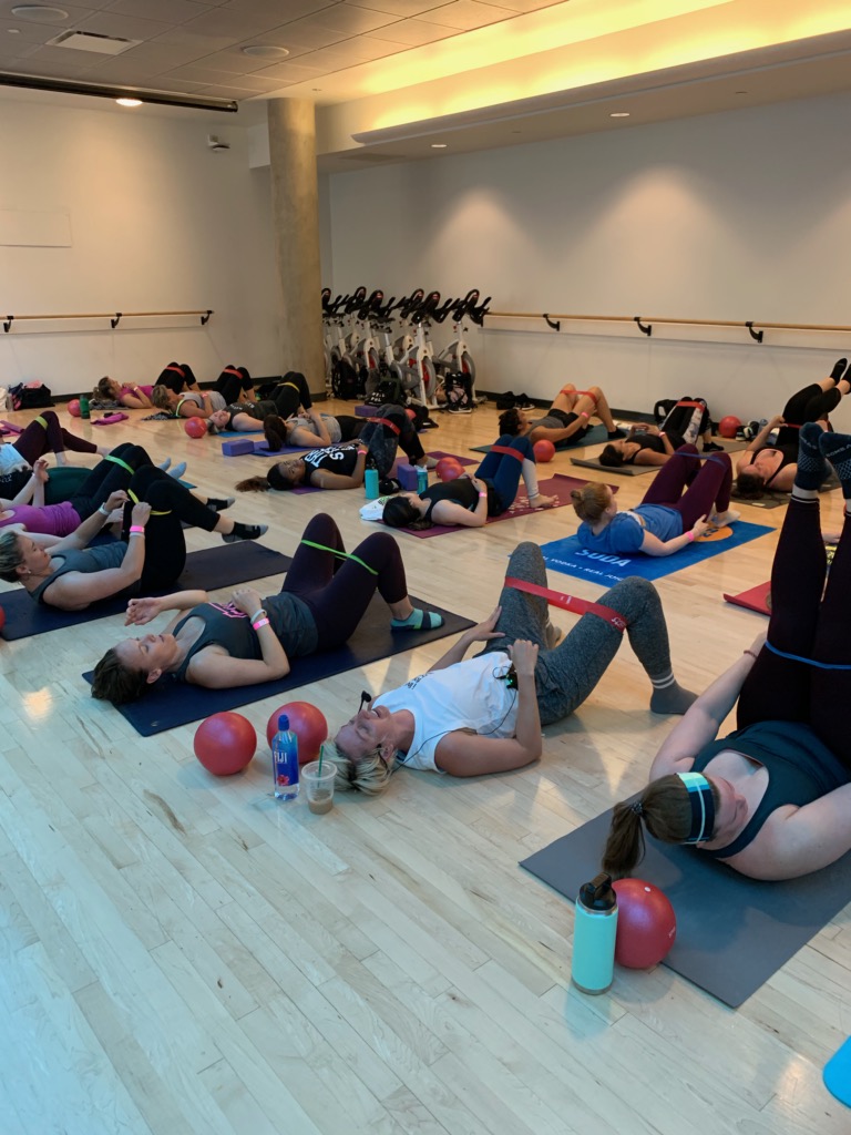I’m not usually one to toot my own horn, but I was truly in my element at this event. Most of the people in attendance thought they were killing it if they went to one or two 60-minute classes. But what the barre bro accomplished was truly not for the feint of heart – for 4 straight uninterrupted hours, I alternated between circuits of high intensity standing and chair-assisted utkatasana. Meanwhile, my slacker wife Callie taught some barre class that didn’t even last an hour. I mean, they weren’t even standing up! Here they are all laying down in Netflix pose with a glorified rubber band around their legs.