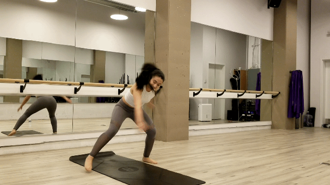A lot of the… movements? Exercises? Let’s just call them sequences – a lot of the sequences have a familiar yoga base, like the one pictured above – we start out in a standard triangle, but then Meg adds some movements to it that make it way more fun and active.